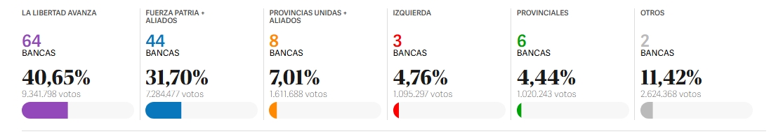 En el Senado, La Libertad Avanza quedaría con un bloque de 19 senadores propios, y el kirchnerismo perderá buena parte de sus senadores. De las 8 provincias que eligieron senadores nacionales, LLA ganó en 6: CABA, Chaco, Entre Ríos, Neuquén, Salta y Tierra del Fuego -obteniendo los dos senadores por la mayoría-. En Santiago del Estero, el triunfo fue para el Frente Cívico de Gerardo Zamora (fue elegido además como nuevo gobernador, su jefe de Gabinete, Elías Suarez); y en Río Negro, ganó Fuerza Patria por un estrecho margen de unos 1.000 votos sobre los libertarios.